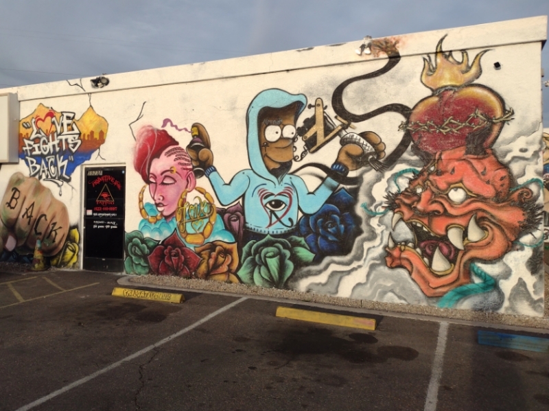 One of the "Love Fights Back" murals at Pr1mitive Ink tattoo shop in Glendale, Arizona. This art is near the front door. (photo property of JoesWorldTour.com - all rights reserved)